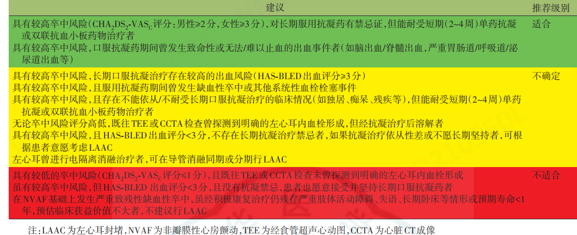 中华医学会心脏电生理和起搏分会、中国医师协会心律学专业委员会联合发布的《心房颤动:目前的认识和治疗建议‑2015》和《心房颤动:目前的认识和治疗的建议‑2018》,均对 LAAC 预防 NVAF 血栓事件给予了Ⅱa类推荐(证据级别B),对LAAC的适应证也进行了说明。《中国左心耳封堵预防心房颤动卒中专家共识(2019)》应对不同的临床情形,包括卒中风险评分,抗凝药物长期坚持的可能性与可行性,出血风险评估以及患者的意愿等具体分析,对LAAC的适应证及其相关技术的应用给予了不同级别的建议(如下表)。